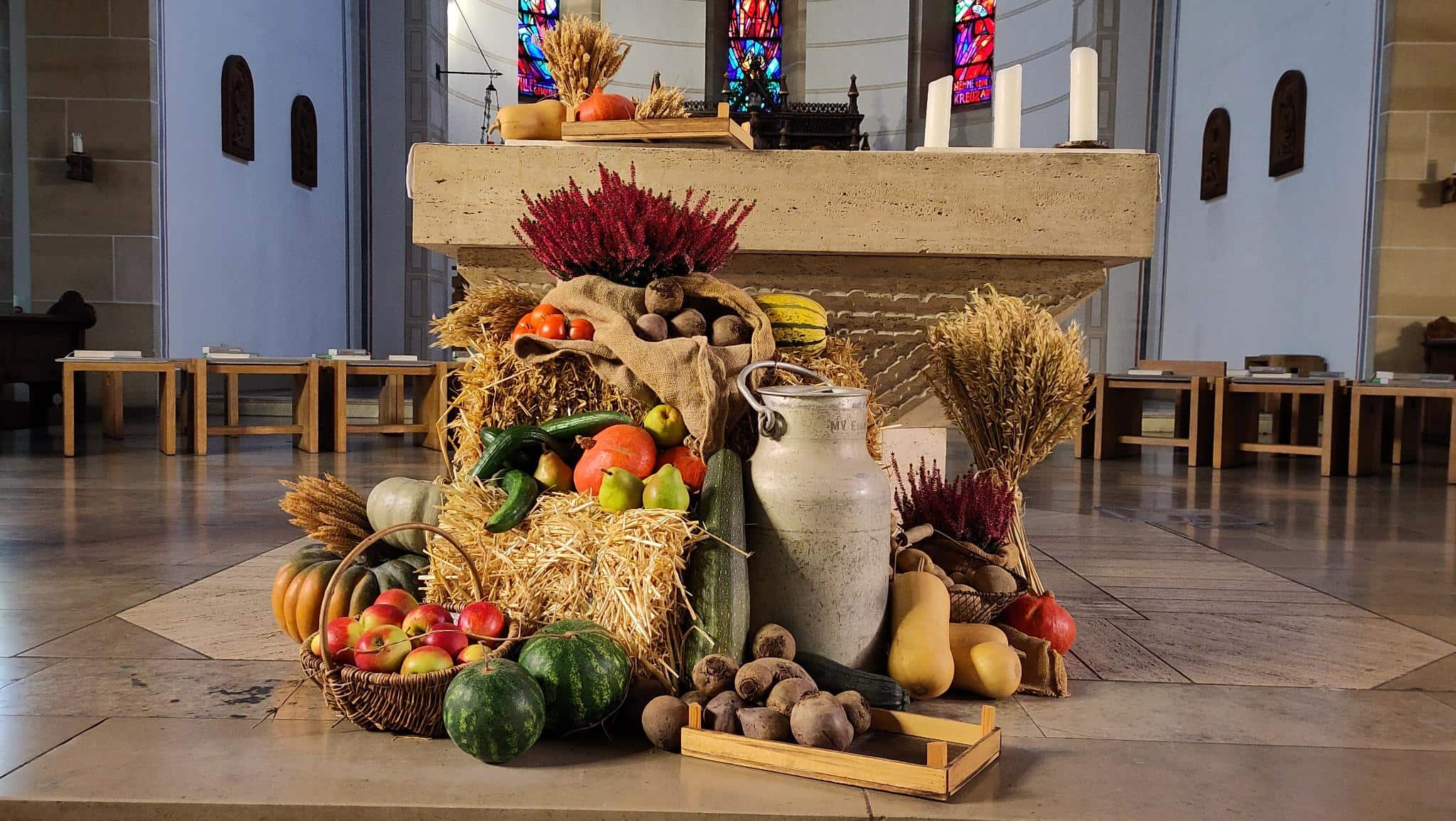 Es ist immer wieder beeindruckend, wie liebevoll und ausdrucksstark der Blumenschmuck in unserer Kirche gestaltet ist. Jetzt zum Erntedankfest können wir es wieder sehen.