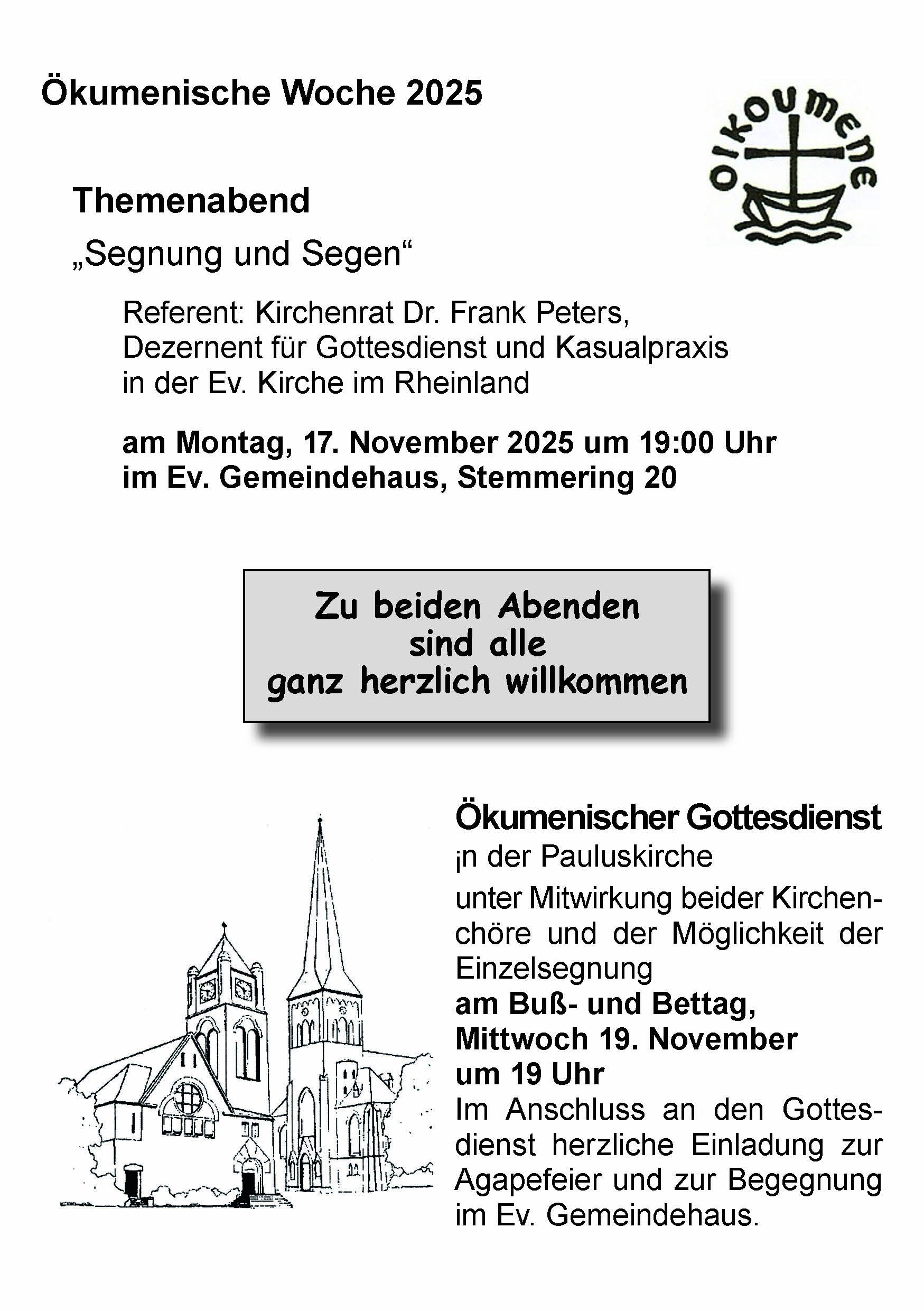 Im Rahmen der Ökumenischen Woche 2025 laden die evangelische und katholische Kirchengemeinde herzlich zu zwei besonderen Veranstaltungen ein. Den Auftakt bildet am Montag, den 17. November 2025 um 19:00 Uhr ein Themenabend im Evangelischen Gemeindehaus, Stemmering 20. Unter dem Titel „Segnung und Segen“ spricht Kirchenrat Dr. Frank Peters, Dezernent für Gottesdienst und Kasualpraxis in der Evangelischen Kirche im Rheinland, über Bedeutung und Praxis des Segnens. Der Abend bietet Raum für Impulse, Austausch und gemeinsame Reflexion über eine zentrale spirituelle Handlung in der christlichen Tradition.
